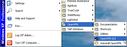 4. Запускаем приложение через иконку на рабочем столе "OpenVPN GUI" или "Пуск - Программы - OpenVPN - OpenVPN GUI"