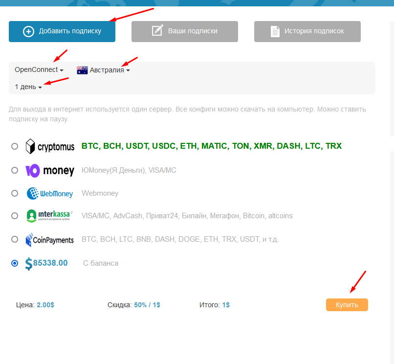 - На странице подписки необходимо выбрать тип подписки, страну, кол-во дней и способ оплаты, далее нажать Купить