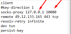 Applyсокс5 будет доступен локально на комьютере по адресу и порту127.0.0.1:10080 - Далее нужно отредактировать ovpn file config добавив строку после