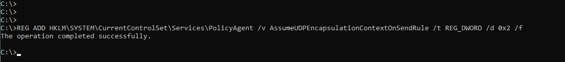 REG ADD HKLM\SYSTEM\CurrentControlSet\Services\PolicyAgent /v AssumeUDPEncapsulationContextOnSendRule /t REG_DWORD /d 0x2 /f -