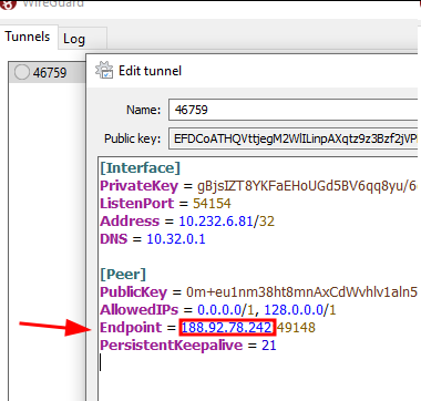 Их можно посмотреть в конфиге, [Peer] -> Endpoint. нажмите правой клавишей на нужный "туннель" и выберите "Редактировать выбранный туннель..."