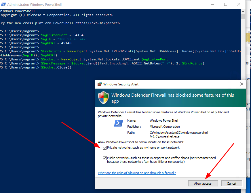 После того, как изменили в скрипте $wgIP и $wgPORT, вставляем его в PowerShell и нажимаем Enter. Разрешите доступ Брандмауэру Windows если запросит.
