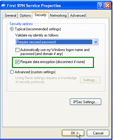 10. Вкладка "Безопасность", выбираем "Требуется шифрование данных (иначе отключаться)", затем нажимаем "OK"