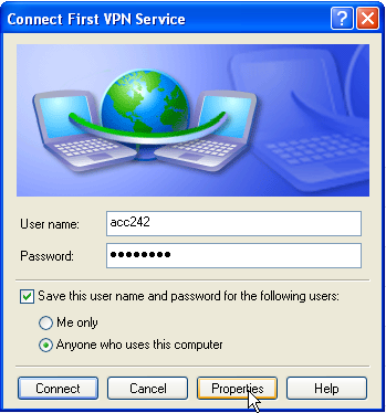 9. Нажимаем дважды на ярлыке на рабочем столе. В открывшемся окне вводим "Имя пользователя" и "Пароль", которые вы получили после создания подписки, выбираем "Сохранять имя пользователя и пароль", нажимаем "Свойства"